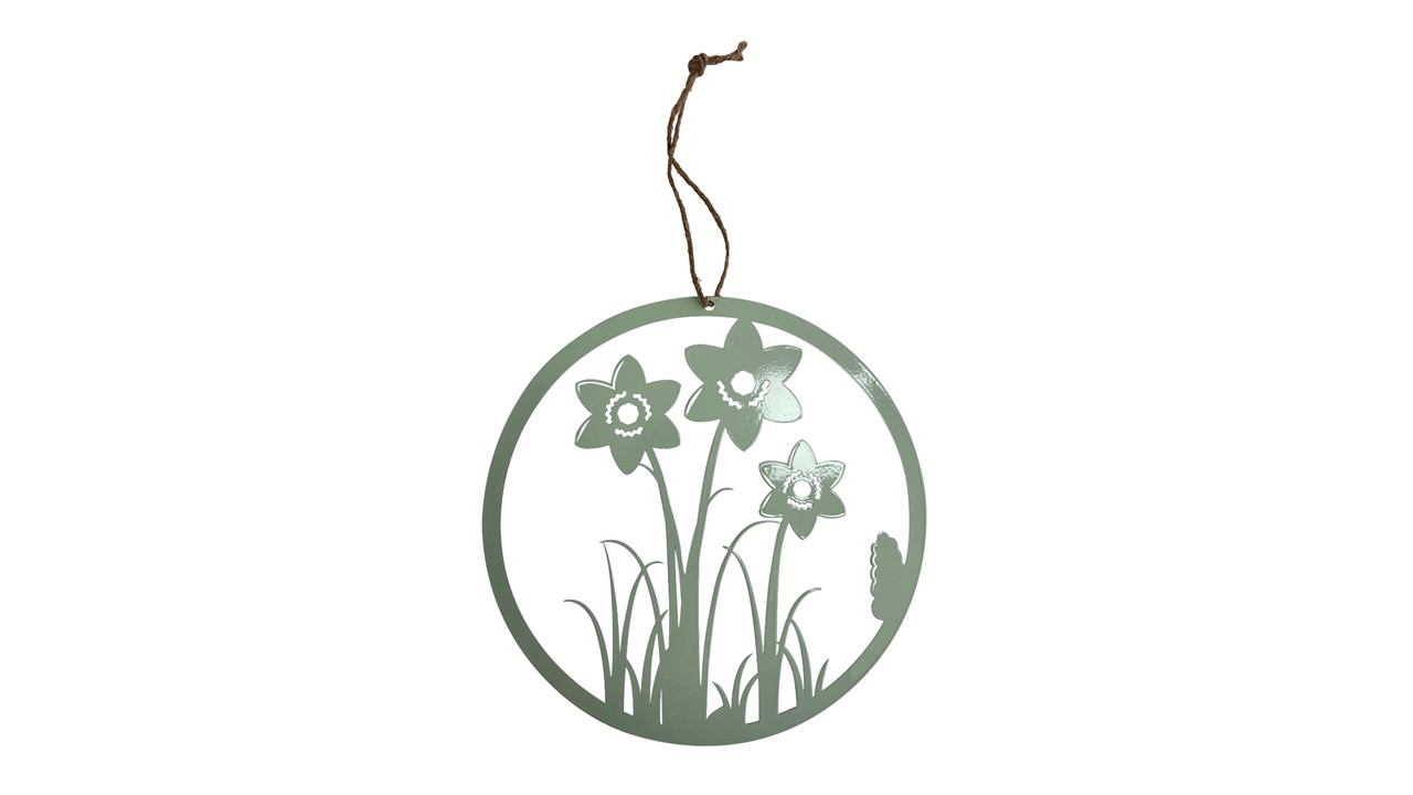 עיטור קיר עגול ופרחים, מתכת ושרוך לתלייה